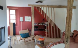 L’agencement « Bla Bla blanc » est un meuble sur mesure logé dans un interstice sous pente. Il propose une bibliothèque et un bureau.
