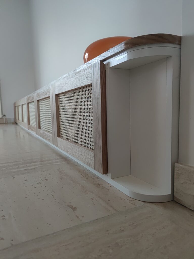 Matériaux : métal, Latté chêne, Cannage rotin et Mélaminé blanc