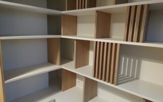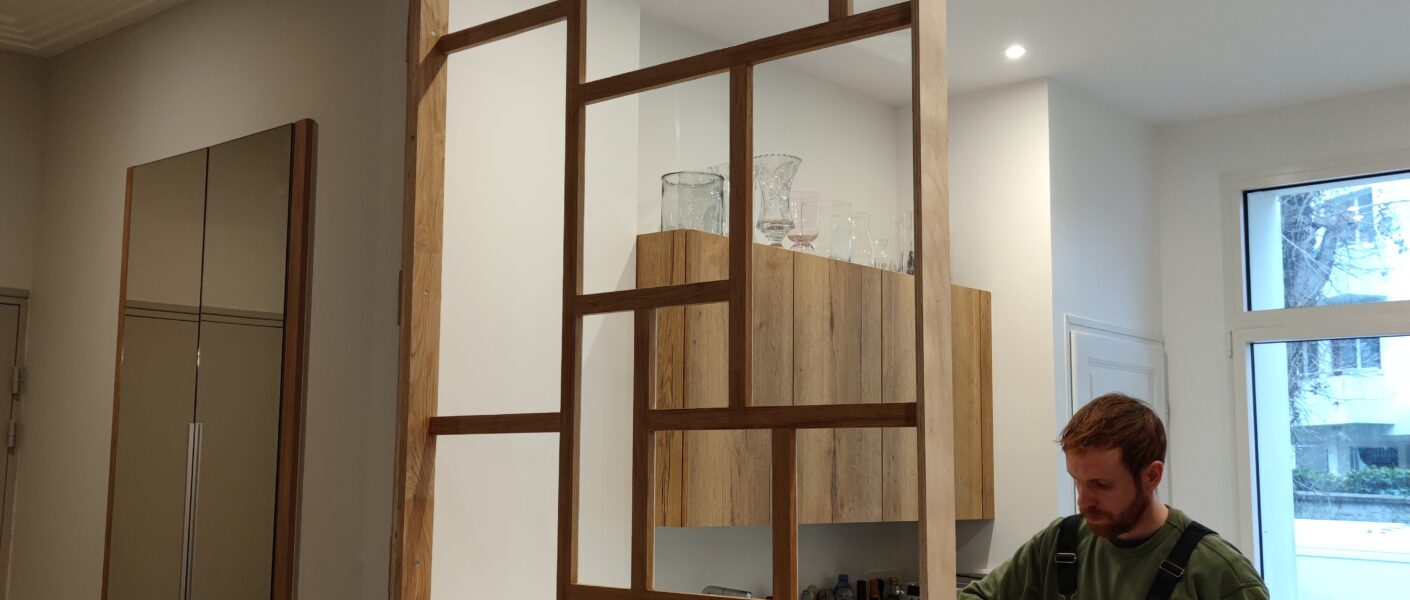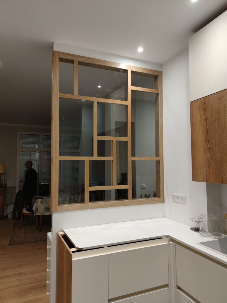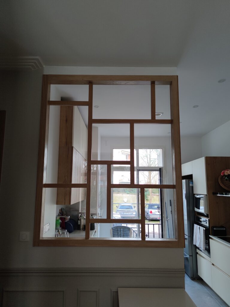 Dimension : sur mesure. Matériaux : lattée chêne, verre